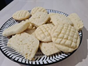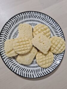 - Acum formam biscuitii. Se poate intinde foaie si decupa cu forma, face bilute si aplatiza sau taia cu cutitul din batonul de coca. Ar trebui sa aiba putin peste 1 cm grosime.