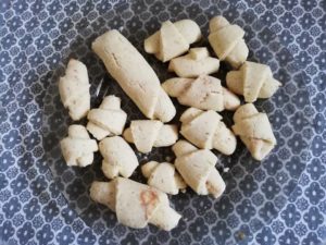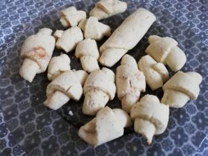 - Am intins bucati mici de aluat, am taiat triunghiuri si format cornuletele.