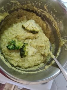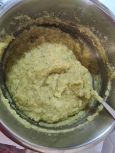 - Cand mamaliga este gata, se adauga broccoli pasat cu furculita si se amesteca totul bine.