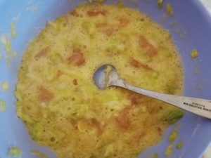 - Intr-un bol maricel se bat cat sa se desfaca ouale, se adauga varza scursa, carnea, verdeata si condimentele (eu sare si piper).