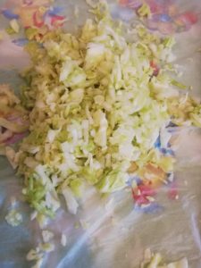 - Varza se toaca fin, se sareaza (1 lingurita), se amesteca bine si se lasa 10 minute deoparte.