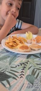 - Noi le-am mancat cu cartofi prajiti si felii de ardei crocant.