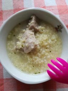 1 an de zile in cap a tinut mania piticului cu ciorba. 1 an de zile nu a mancat decat ciorba si la pranz si seara. Acum o refuza cu vehementa. Noua adoratie – meiul. In zilele in care primeste mei refuza orice alteva. M-am conformat si am facut si pilaf de mei, nu doar mei cu prune uscate. Succes rasunator, de asteptat de altfel 🙂