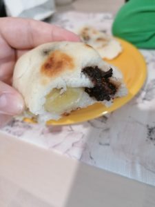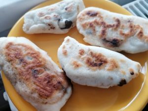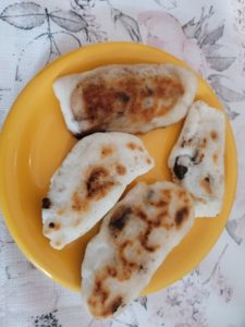 Umplutura poate varia, coca este de baza in cazul produselor fara gluten Aveam inima indoita, nu ma asteptam la un rezultat favorabil. Ce-i drept, nici cand consumam gluten nu faceam placinte la tigaie. Initial am vut sa fie cu cirese, dar am ramas fara. Am recurs la o combinatie indragita de toti: banana si ciocolata. Nu am prea multe poze caci juniorul plangea ca folosesc toata ciocolata si nu mai are ce manaca. Ramane sa incerc si varianta sarata. Recunosc, cu cartofi, varza si marar as mana cel mai tare. Pitic fericit! 🙂