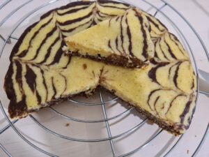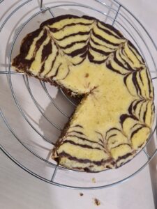 - Intr-o tava de 20 cm punem cate 2 minguri din compozitia alba si 2 din cea cu cacao. Alternam pana terminam compozitia. Cu o scobitoare tragem linii din centrul tavii catre marginile exterioare.