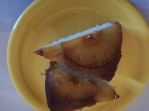 Cel mai bun tort din ultima vreme! Fara prea mult zahar, fara gluten si fara lactate. Zaharul se poate omite daca compotul de ananas este suficient de dulce. Eu nu am mai adaugat.Am cumparat un compot de ananas la borcan de sticla, indulcit cu suc de struguri. Zeama compotului nu este foarte dulce, dar suficient cat sa nu mai fie nevoie de zahar. Zahar am pus doar la ars.
