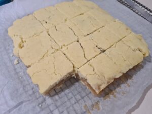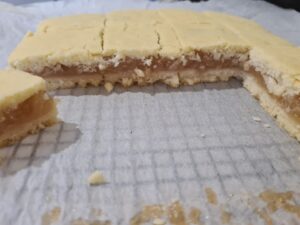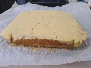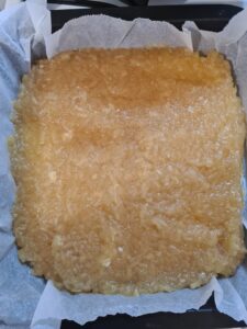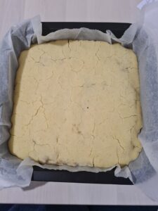 - Intr-o tava cu hartie de copt, am pus jumatate din compozitia de la blat.
